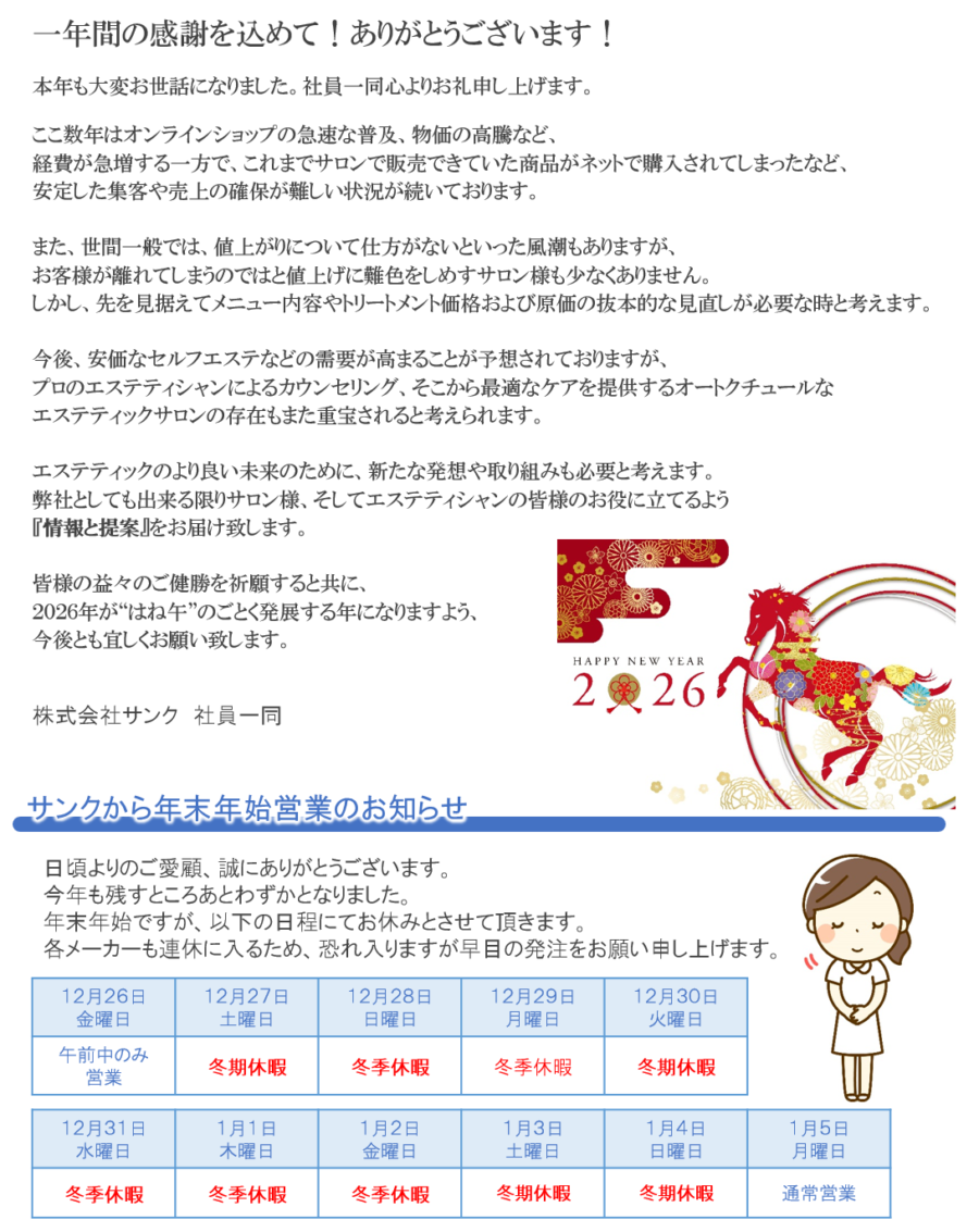 2026年1月1日 / 最終更新日 : 2026年2月24日 cinq_admin 2026年1月号 新年のご挨拶 フリーダイヤル 0120ー77ー9439 〔営業時間:平日10時~18時〕 FacebooktwitterHatenaPocket